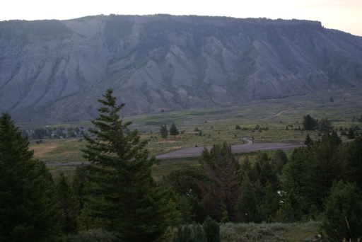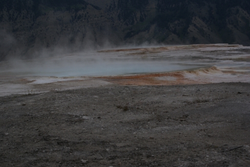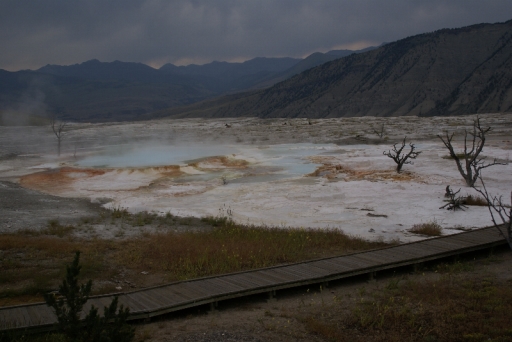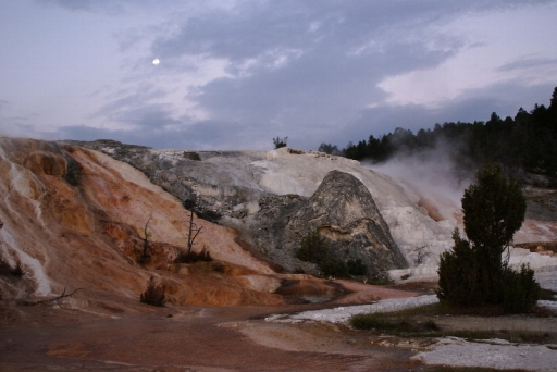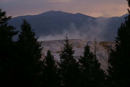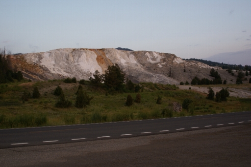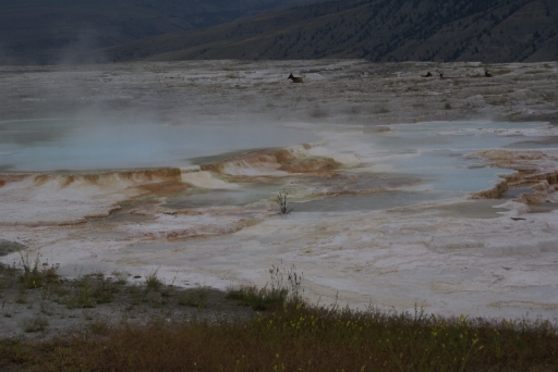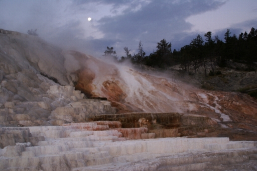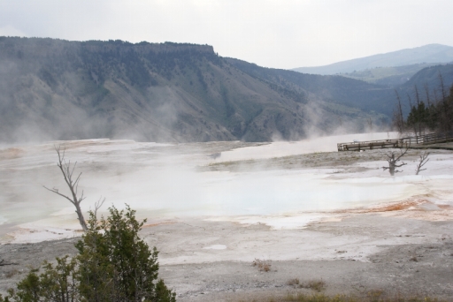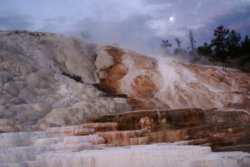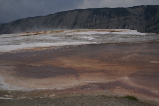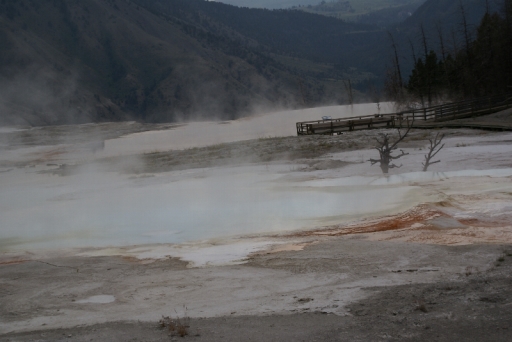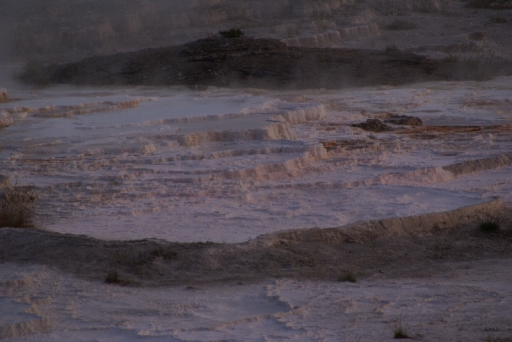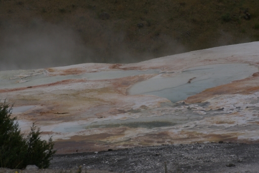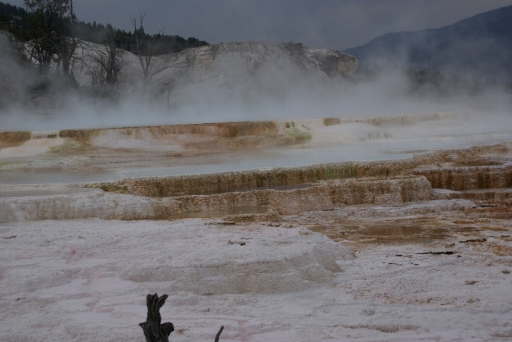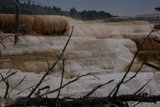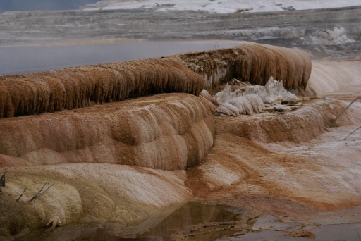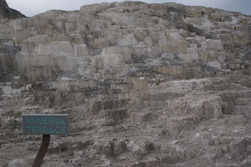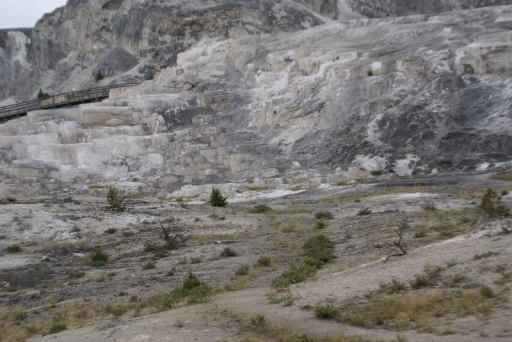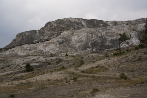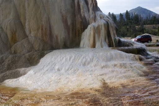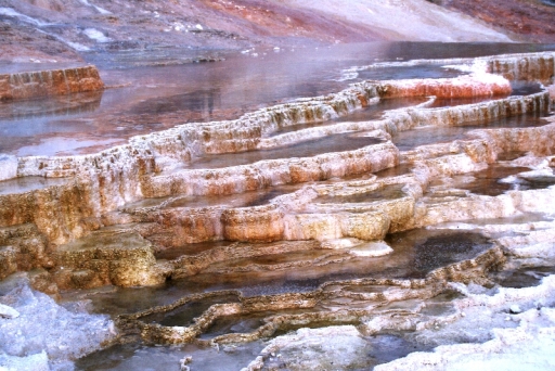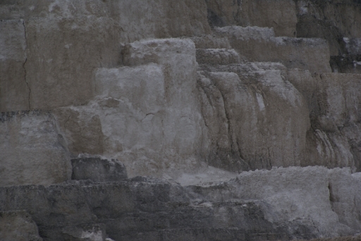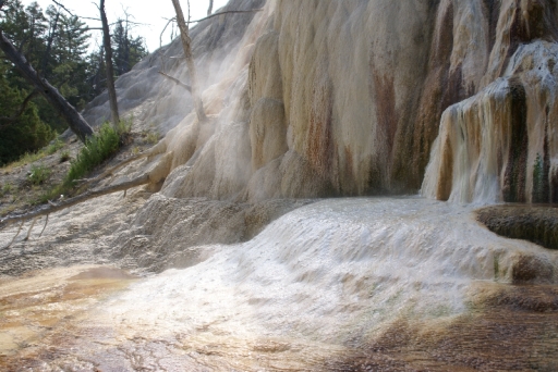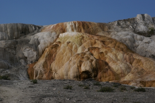 | マンモス・ホット・スプリングの最大の景色 テラス・マウンテン 地底から吹き上げられた温泉に含まれる石灰分が蓄積され、幾重にも積み重なったもの。 |