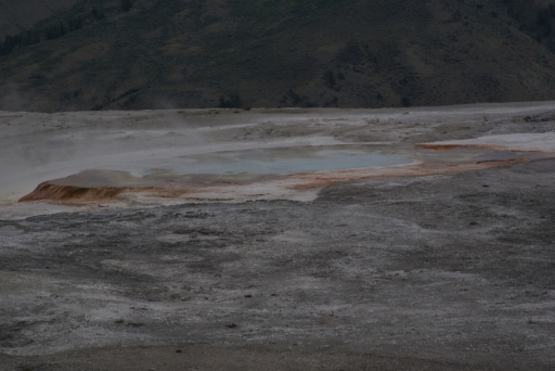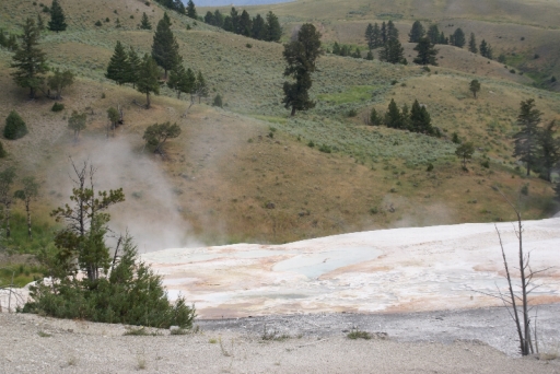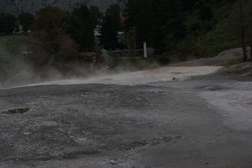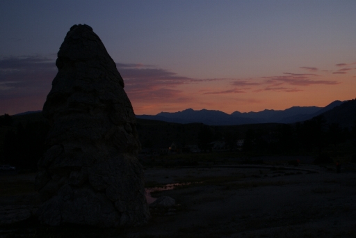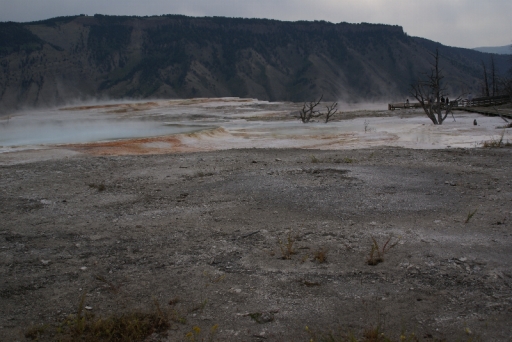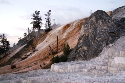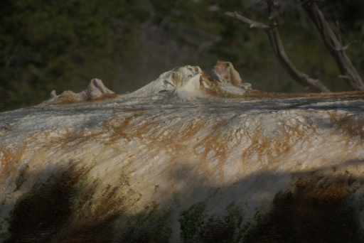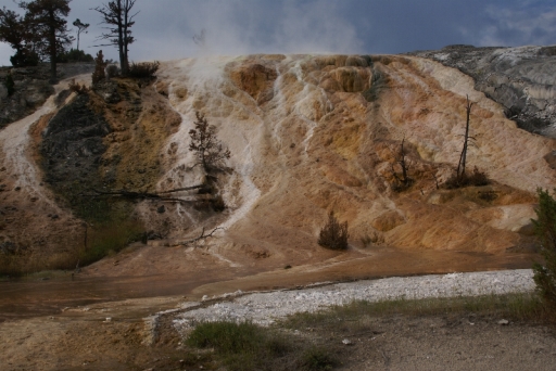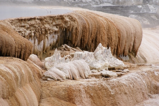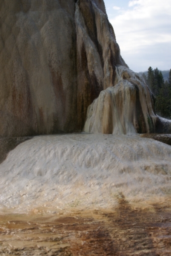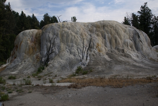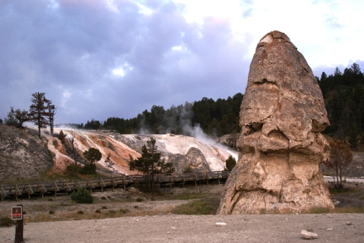 | リバティ・キャップ テラス・マウンテンの前に立つ石灰石の岩です 以前は温泉が噴出していたようですが、今では噴出孔をふさいでしまっています。 |
