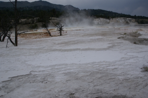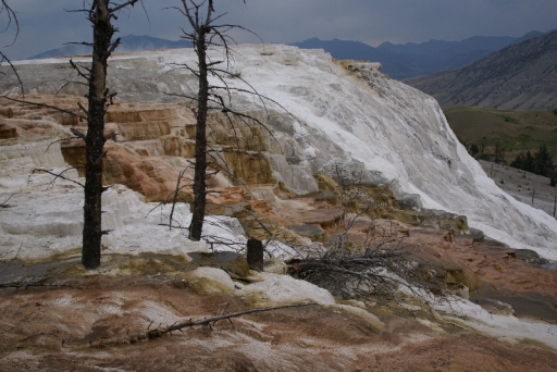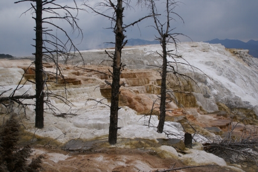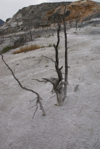 | 松が石灰に閉じ込められて立ち枯れています。 | |