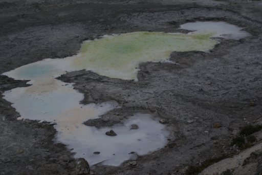 | 温泉水の溜まった段丘のお湯たまりはエメラルド色が多く存在しました。 | |