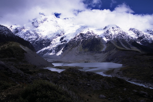 一時間も歩くとマウントクックが谷間から忽然と姿を現した