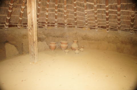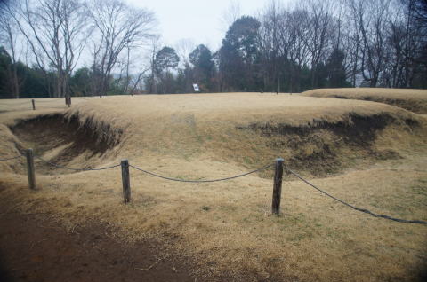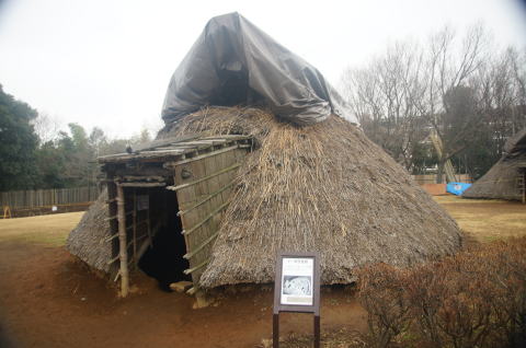 | 竪穴住居は周辺の宅地レベルから60から70センチ掘っている 建物の周りにはふぉりを巡らして臼井が入り込まないように作られている。 この建物内の広さは44平米、8畳二間に6畳,4畳半の広さです。 |