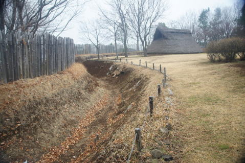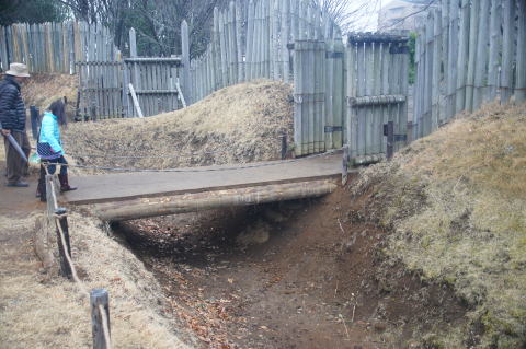 | 集落への出入りには橋が架けられてました。濠の外郭には 木柵で囲われていました。 |