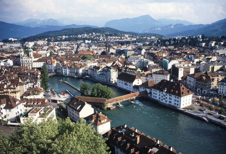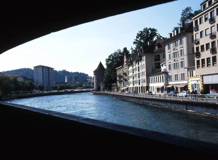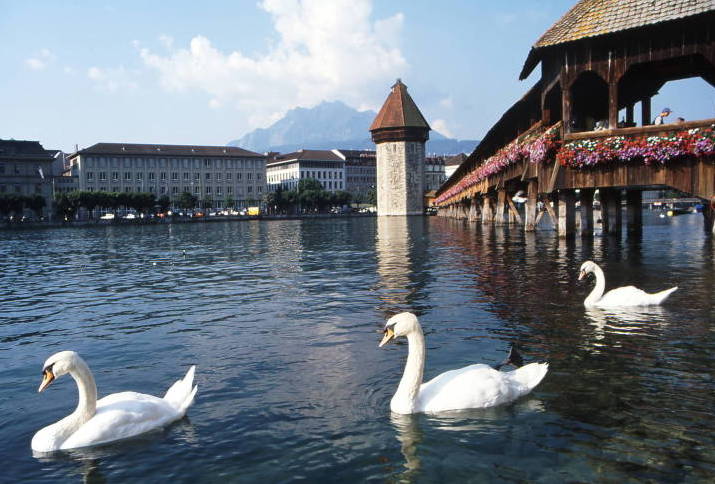 ローヌ川にかかるカベル橋は14世紀に造られた長さ200メートルの木橋でヨーロッパ最古の橋です。屋根で覆われているのが特徴屋根の下の梁には17世紀に描かれた板絵100枚が掲げられています。