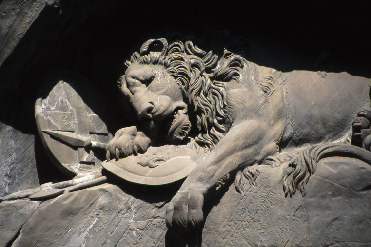 フランス革命のさなか(1789年)フランス国王ルイ16世の警護の当たっていた、スイス人傭兵786人がパリ・チュイリー宮殿で殉職したのを追悼して彫られたもの。